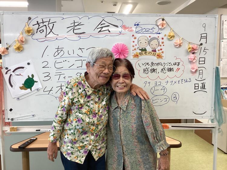 敬老の日をお祝いしました。仲良しお二人の、肩を並べてのツーショットです。✌